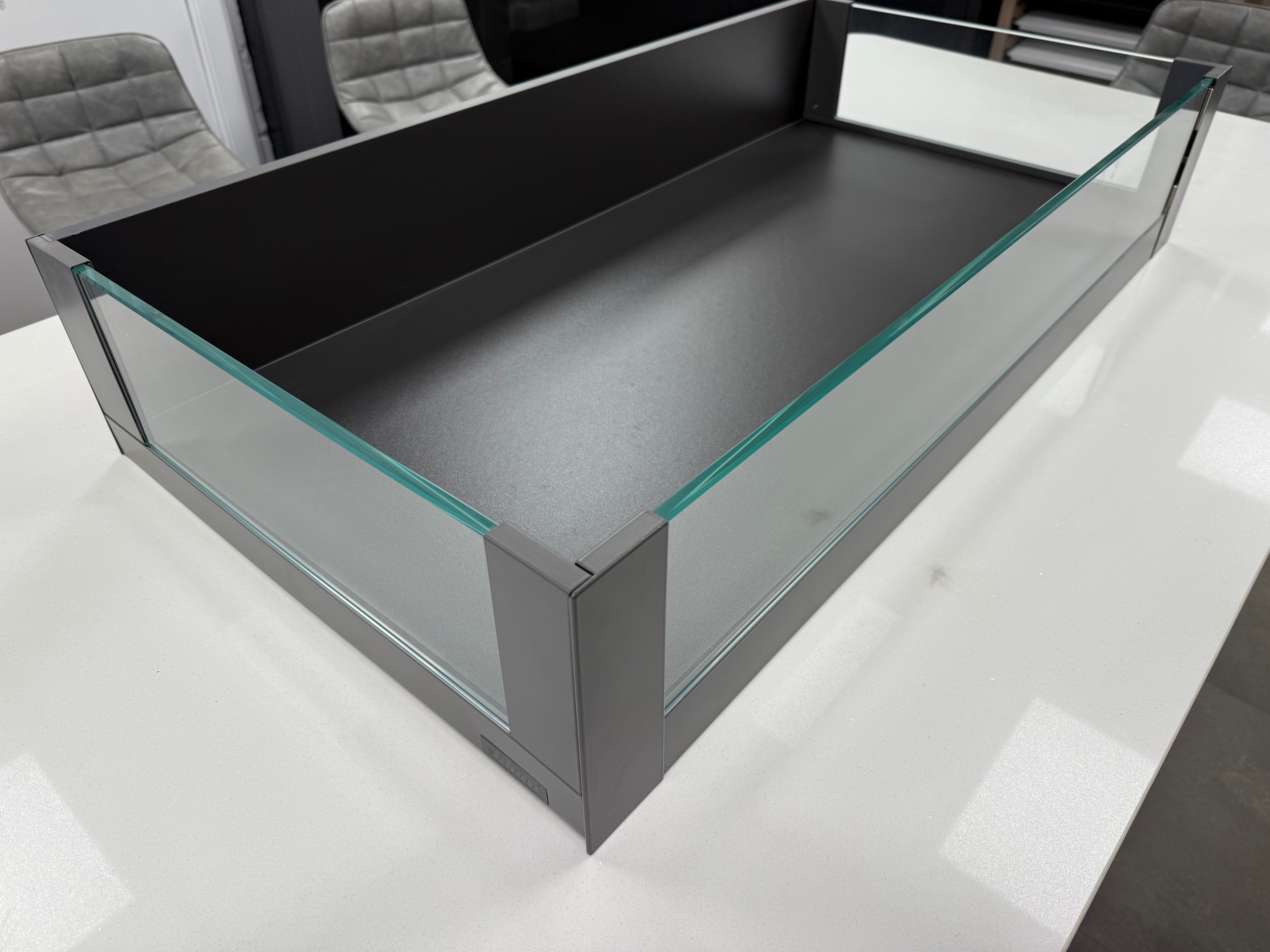 The Legrabox Free drawer system has a modern slim profile with 12.8mm thick side walls with a 10mm thick glass large design panel, this combined with the 40kg Blumotion soft close runners make it an extremely robust and versatile drawer which opens and closes effortlessly even when heavily loaded. Legrabox offers three-dimensional front adjustment within the drawer side.